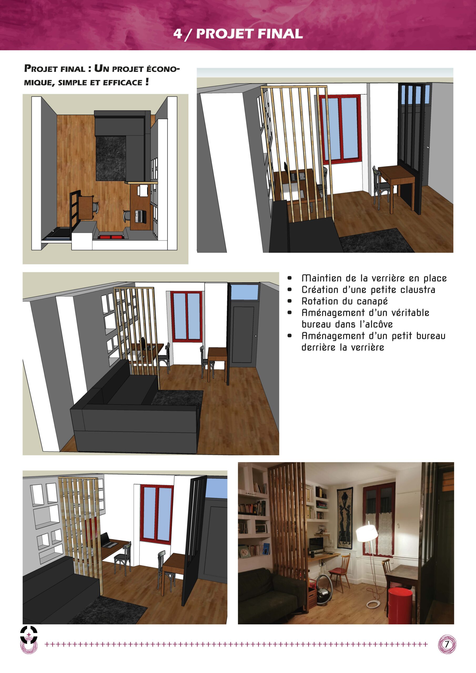 Une réponse sur-mesure privilégiant la fluidité et l'économie de moyens. L'installation d'un bureau filant le long du mur est rythmée par des claustras en bois, créant une séparation visuelle douce sans occulter la clarté naturelle.