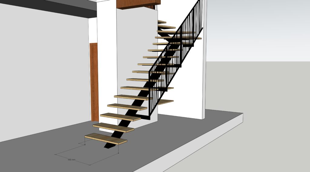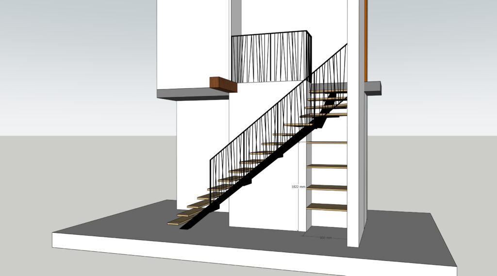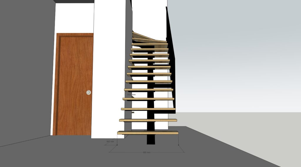 Elle a permis de valider les points critiques du projet : le passage précis sous une poutre existante, le calcul de l'angle du quart de tour et l'ergonomie des marches.