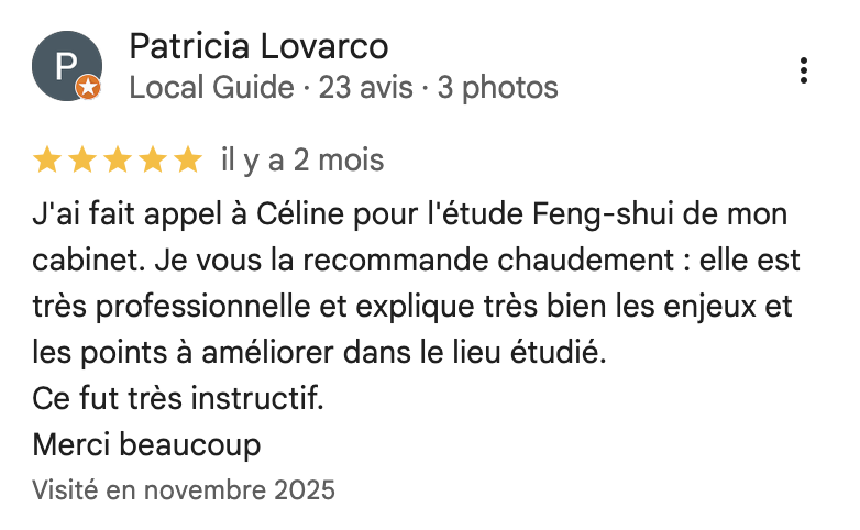 « J'ai fait appel à Céline pour l'étude Feng-shui de mon cabinet. Je vous la